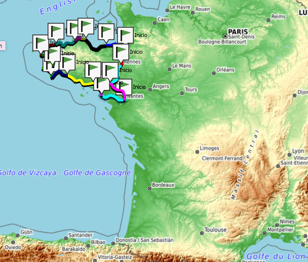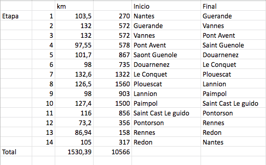 Serán 14 etapas, con ese desnivel de unos 10.000 metros, creo que no está nada mal. Mucha carretera interior, sube y baja y mucha curvita por la costa. Mucha foto de mar, acantilados, castillos y espero que, muchas ostras¡¡¡¡