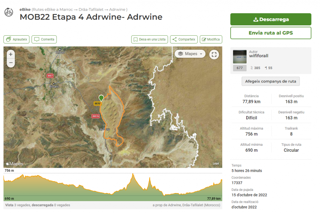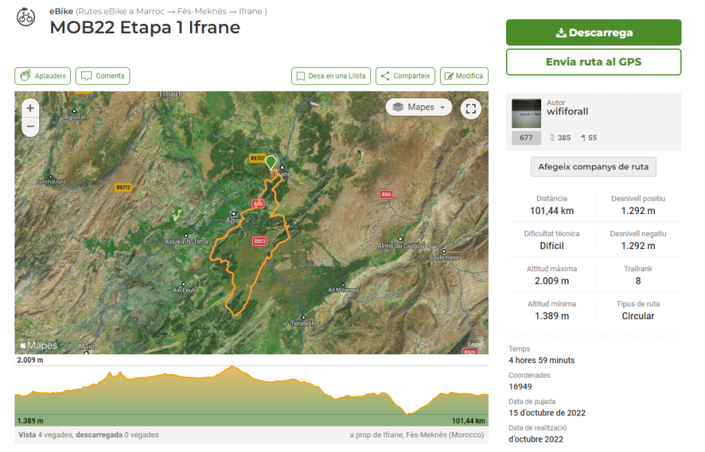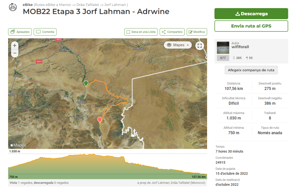 Fueron 5 Etapas de bicicleta de montaña donde se combinaron duras rampas los dos primero días, largas llanuras y mucha arena. Este año, curiosamente apareció la lluvia, un poco de frío y muy poco calor. Se hizo muy llevadero. Las dos primeras alrededor de Ifrane, por los bosques de cedros y monos. La ruta transcurre por el parque nacional y recorre diversas pista de un entorno verde-seco ( curioso), protegido.